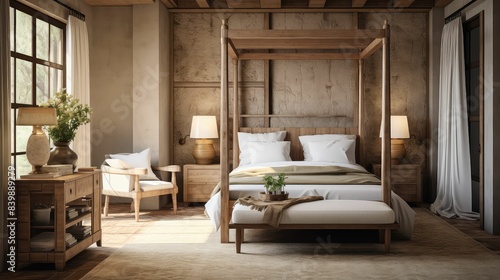 poster, sample, interior, design, illustration, bedchamber, rustic, wooden, 4, linen, pillow, wallpaper, warmth, depth, vintage, dresser, reading, nook, charming, inviting, atmosphere, cosy, focal, textured, space, soft, plush, comfortable, inspired, complete, room, ornamented