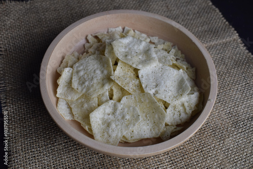 Potato chips in a wooden bowl