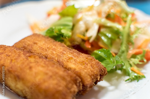 Potato croquette filled with cheese and herbs served with fresh green salad, tomatoes and pepper