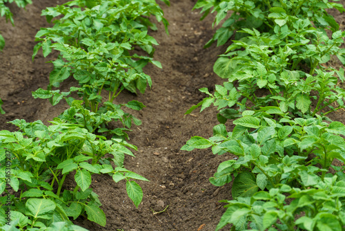 Potato cultivation. Green plantations of new potatoes. Leaves and bushes in close-up.