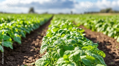 Potato Plantation: Rows of vibrant green potato plants flourishing in a sun-drenched field, showcasing the beauty of agriculture and the promise of a bountiful harvest.
