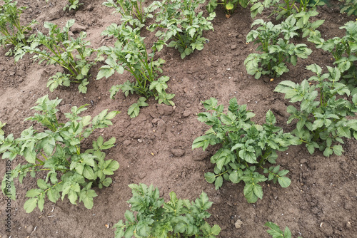 Potato planting on the ground. Natural economy. Breeding, caring for vegetable crops concept