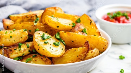 potato, slice, spice, seasoning, herb, green onion, parsley, dill, coriander, sauce, gravy, ruddy, gold, crispy, fragrant, spicey, savoury, appetising, delicacy, treat, side dish, snack, cooking, kitchen, receipe, toasty, freshness, naturalness, health food, delicious, satisfying, tidbit, portion