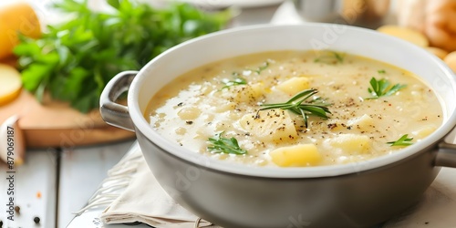 Potato Soup Simmering on Stove in a Cozy Family Kitchen Setting. Concept Potato Soup, Cozy Kitchen, Family Setting, Simmering Stove, Comforting Meal