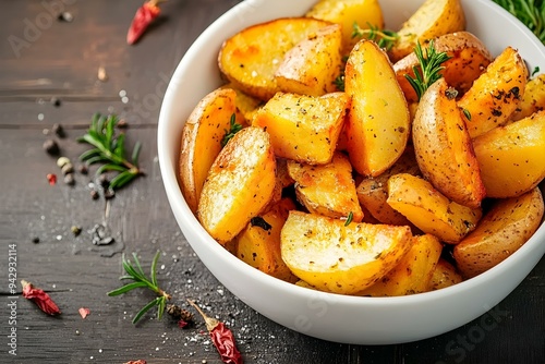 Potato Wedges in a White Bowl with Herbs