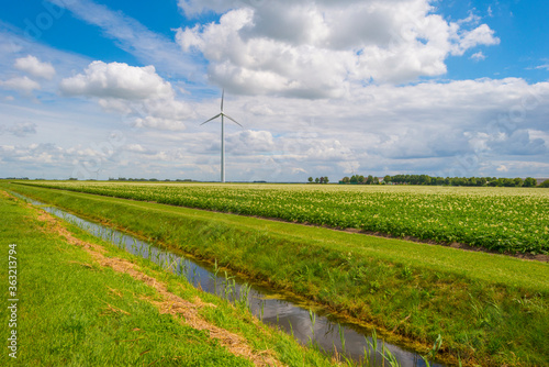 potato, agriculture, vegetable, plant, farmland, flower, flowering, wind turbine, tree, farming, harvest, summer, field, nature, natural, industry, green, grass, scene, ditch, panorama, sky, blue, outdoors, day, sunny, sunlight, scenic, landscape, rural, country, countryside, perspective, quiet, restful, horizon, holland, wind, energy, power, windmill, electricity, turbine