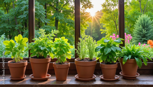 Potted herbs on a windowsill with sunrise in the background