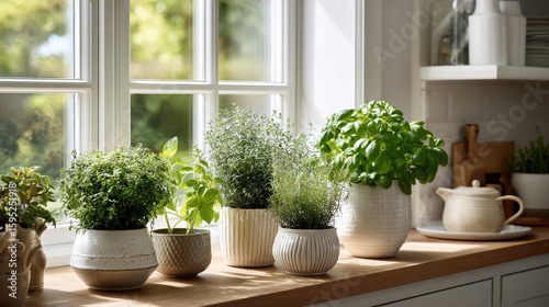 herb, potted plants, window, countertop, kitchen, basil, thyme, rosemary, natural light, indoor, leaf, shelf, dish, teapot, white paint, daylight, greenery, flora, cooking, cookery, home decor, interior, garden, herb, aromatic, fresh, sunlight, residential, window sill, kitchen utensile, tableware, closeup, organic, healthy
