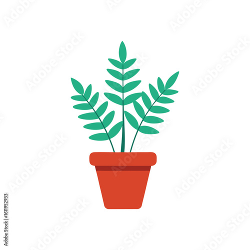Potted Plant Illustration with Green Leaves in a Red Pot on white background