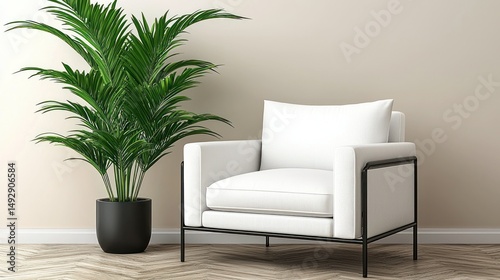 plant, pot, chair, white, cushion, room, interior, home, decor, furniture, indoor, house, design, modern, contemporary, minimalist, style, background, wall, light, shadow, peaceful, calm, relaxation, resting, comfort, cosy, soft, luxury, simple, elegance, lifestyle, decoration, bright, clean, apartment, residence, floor, wooden, parquet, pattern, neutral, beige, tranquil, serenity, indoor, nobody, staged, empty