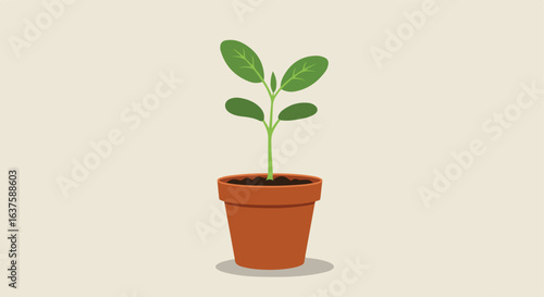 Potted sprout with green leaves, in brown pot with soil, on beige surface, flat design