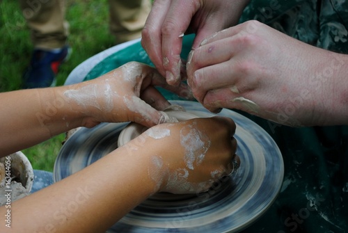 Potter's hands guiding child's hands to help him to work with the pottery wheel