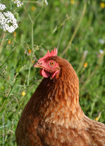 red hair, rural, field, outside, hen, chicken, animal, fowl, free, liberty, free-range, flower, flower, happy, happy, luck, nature, portrait, healthy, brown, rural, meat, egg