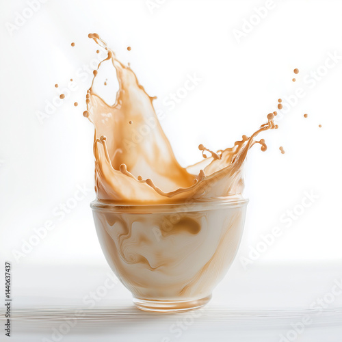 Pour soy milk into a cup filled with glass, with a white background cutout, dynamic.