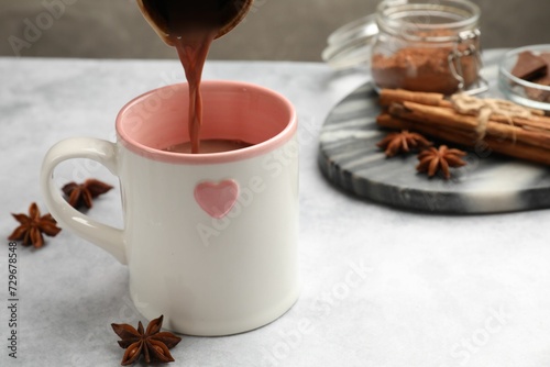 Pouring tasty hot chocolate into cup at light table, closeup. Space for text