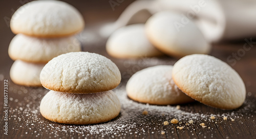 Powdered Sugar Cookies Stacked on Wooden Table, Delicious Baked Pastry Photography for Food Blogs and Recipe Websites