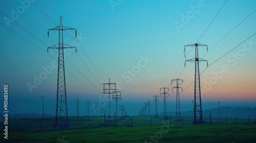 power, line, tower, horizon, hazy, dusk, sky, blue, pink, field, grass, metal, electric, wire, rural, landscape, sunset, silhouette, mist, fog, nature, energy, electricity, infrastructure, industrial, transmission, network, grid, outdoors, open, countryside, environment, calmness, peaceful, evening, twilight, dark, light, calm