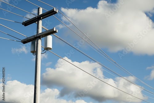 Power Pole Against a Blue Sky with Fluffy Clouds on a Bright Day in the Countryside