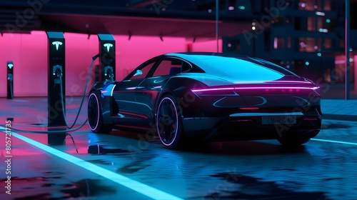 Power supply connect to electric car for add charge to the battery. Charging re technology industry transport which are the future of the Automobile.