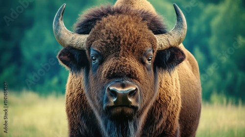 Powerful American Bison Facing Camera in Natural Green Environment