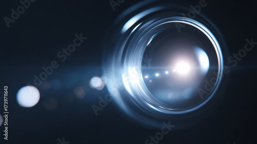 Powerful camera lens with blue light flare creates an abstract optical bokeh background. rotating technology feels futuristic, cinematic, and full of focused energy