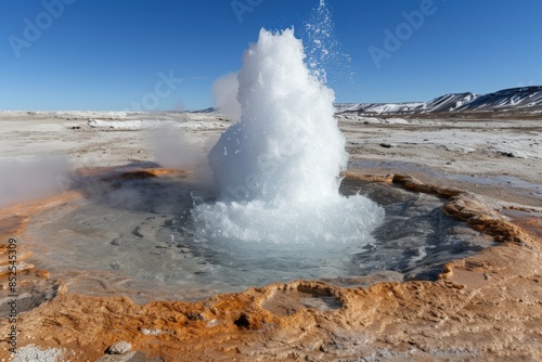 Powerful geyser eruption in snowy landscape