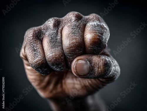 Powerful, high-contrast studio photograph of a clenched fist, symbolizing strength and determination. Dramatic side-lighting highlights skin texture.
