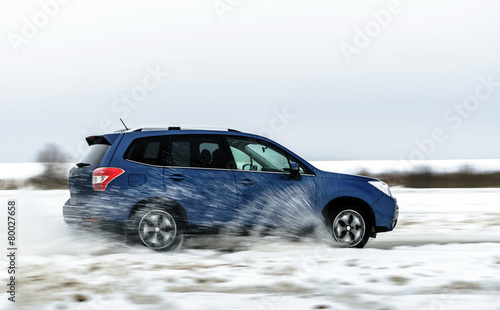 Powerful offroader car sliding by lake ice
