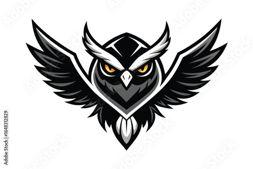 Powerful Owl Mascot Logo with Wide Wings and Piercing Yellow Eyes