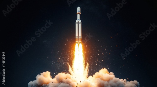 Powerful space rocket launch in outer space. Fiery exhaust plumes blast upward. Ascending trajectory against dark cosmos background. Futuristic tech illustration. Spaceship concept for exploration.
