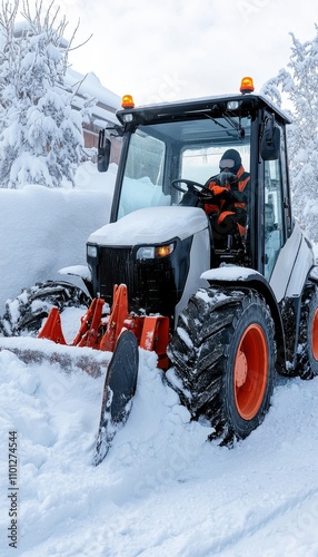 winter, snow, road, vehicle, machine, tractor, equipment, driver, maintenance, cleaning, blade, service, orange, black, white, outdoors, cold, heavy, clearing, nobody, day, transportation, power, snowfall, storm, blizzard, municipal, work, industrial, wintery, residential, neighbourhood, tree, countryside