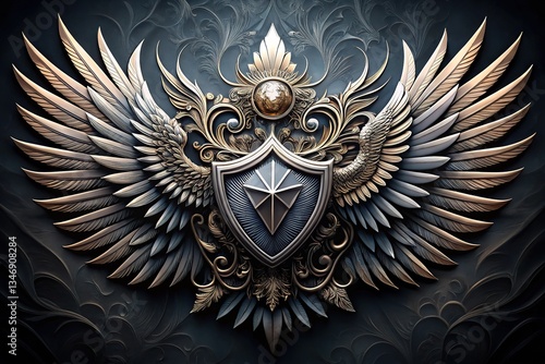 wing, emblem, badge, graphic, illustration, fantasy, courage, black-and-white, geometric, ornate, high contrast, digital artwork, art deco, minimal, elegant, wingspan, symbolism, fantasy art, graphic design