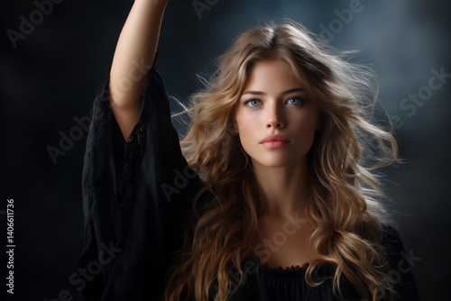 woman, fist, power, determined, moody, beauty, hair, model, fashion, face, glamour, black, make-up, brunette, dark, make-up, person, lip, 1, eye, studio, people, elegance, lady, closeup, skin, gorgeous, sensuality, red