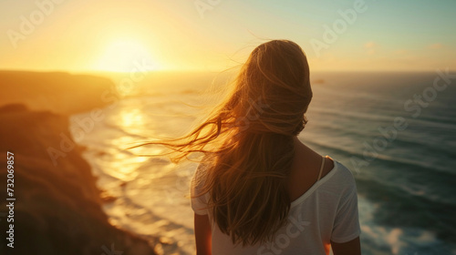 powerful woman standing on a cliff overlooking the ocean at sunrise, her hair flowing in the wind, symbolizing strength and freedom