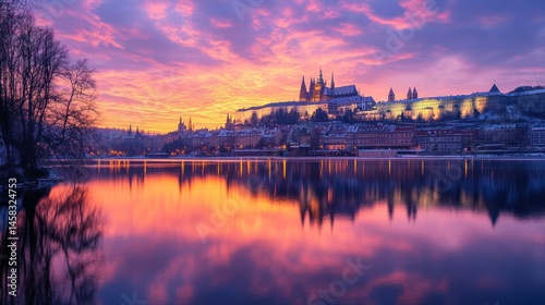 castle, prague, sunset, city, river, water, sky, cloud, architecture, building, landscape, europa, travel, photo, winter, snow, twilight, evening, colours, scenic, beautiful, amazing, vista, view, panorama, image, picture, photo, artwork, art, nature, scene, serene, calm, peaceful, tranquil, romantic, magical, light