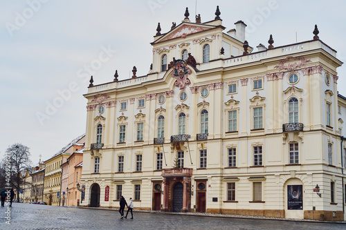 Prague, Czech Republic - January 7 2021: Empty Hradčanské square in front of Prague Castle is surrounded by Schwarzenberg and Arcibishop palaces