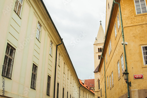 Prague, Czech Republic. 10.05.2019: Detail of the yellow facade of a historic building in the old town of beautiful Prague, Czech Republic. Golden hourly photograph. The sun shines on the facade.