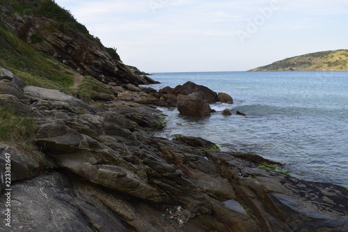 Praia com pedra, colina verde,