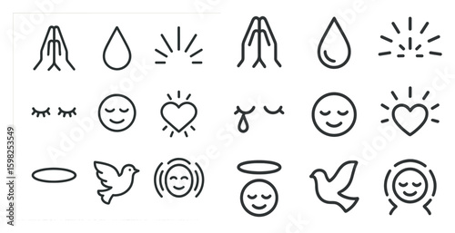 Prayer and meditation line icons set – outline, peace, mindfulness symbols