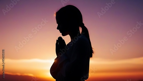 prayer concept featuring silhouette young girl praying pose set vibrant sunrise sunset sky symbolizing sacrifice obedience humility trust