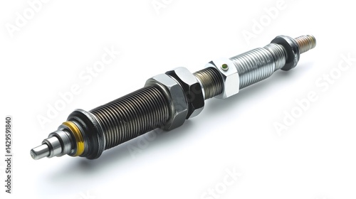 actuator, automation, machinery, engineering, technology, component, part, machine part, precision, mechanism, metal, steel, chrome, silver, white background, isolated, closeup, detail, hardware, equipment, manufacturing, industry, machine-building, robotic, assembly, disassemble, nut, bolt, screw, threaded, piston, cylinder, spring, damper, landscape, high-quality