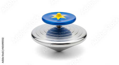 Precision-Engineered Metallic Spinning Top with Colorful Disc on Pure White Background