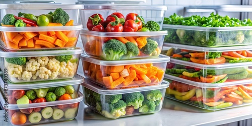 Pre-cooked vegetables stored in reusable box containers in the fridge, pre-cooked, vegetables, reusable, box