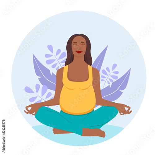 Pregnant dark-skinned woman meditating in nature. Illustration in flat style. Concept illustration for prenatal yoga, meditation, relax, healthy lifestyle.