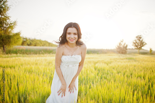pregnant gorgeous brunette woman on the field with wheat and pop