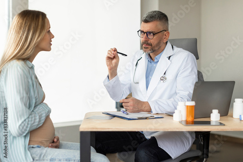 Pregnant woman getting professional consultation at prenatal clinic, sitting in medical office and talking. Pregnancy, healthcare concept