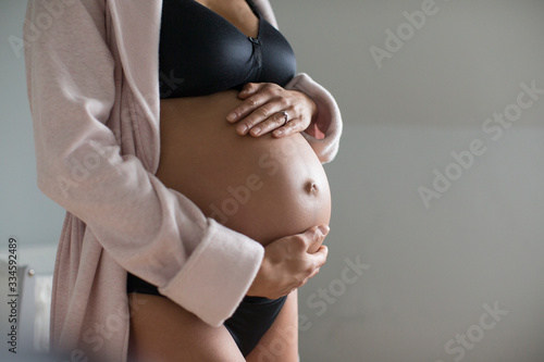 pregnant, woman, bra, panty, hold, stomach, connection, bathrobe, expectant, mother, anticipation, future, milestone, life, growth, hope, beauty, tender, femininity, serene, people, calm, love, affection, touch, well-being, rub, mixed race, caucasian, filipino, mid, adult, alone, 1, person, indoor, cropped, midsection, racked