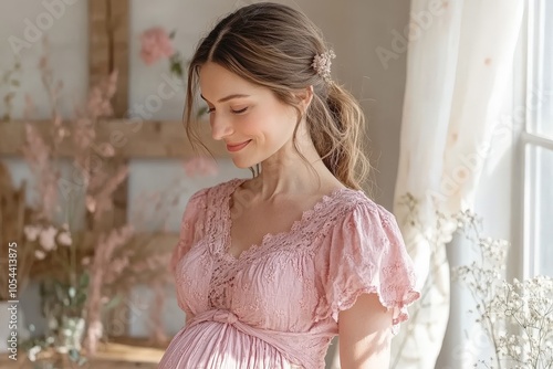 Pregnant woman in soft pink dress in elegant natural light filled room surrounded by delicate floral decor symbolizing beauty gentleness and the journey of motherhood