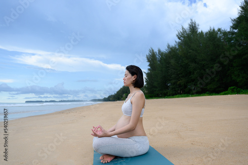 Pregnant woman practices yoga and meditation while doing lotus poses and sits on the peaceful beach with a nature scene- Healthy lifestyle concept