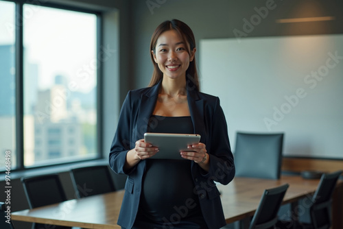 pregnant woman standing and holding tablet mobile at office, generative AI